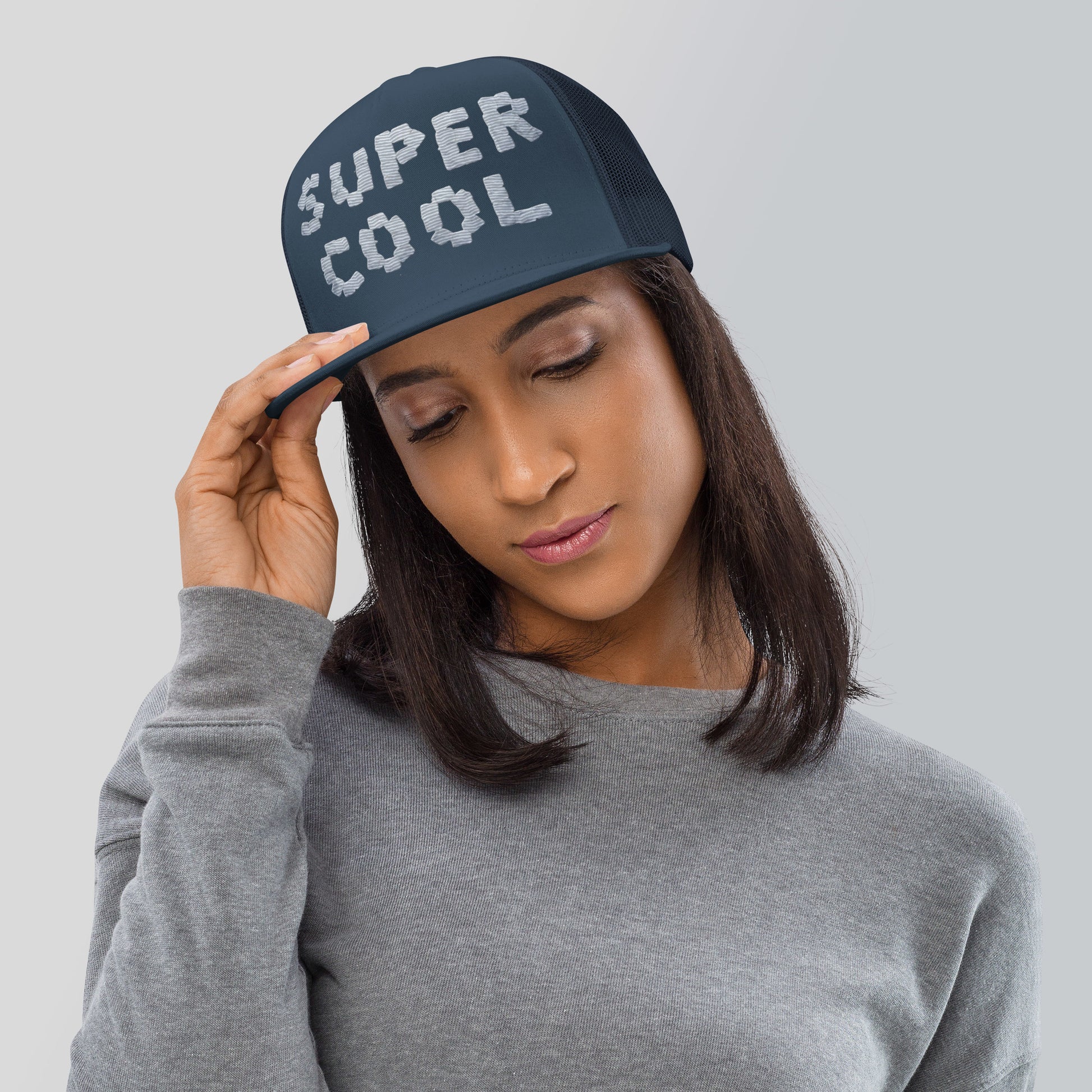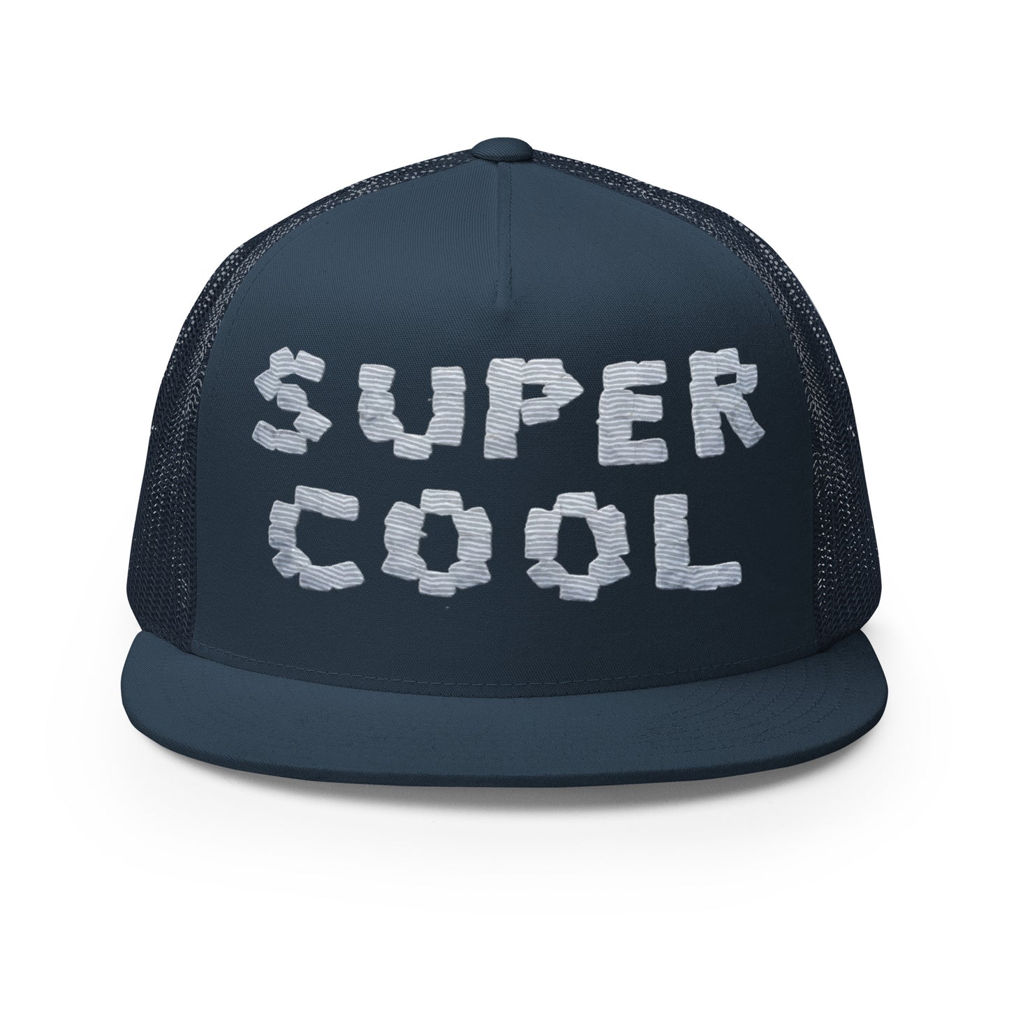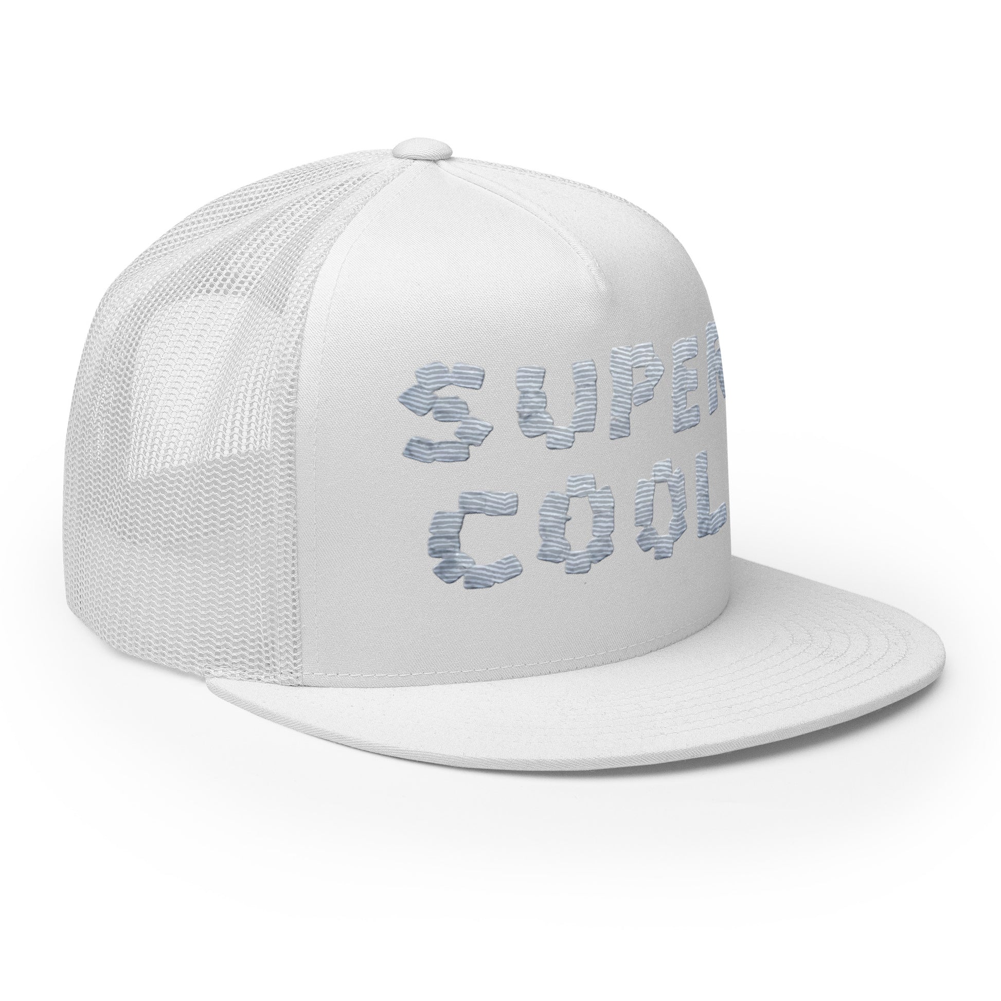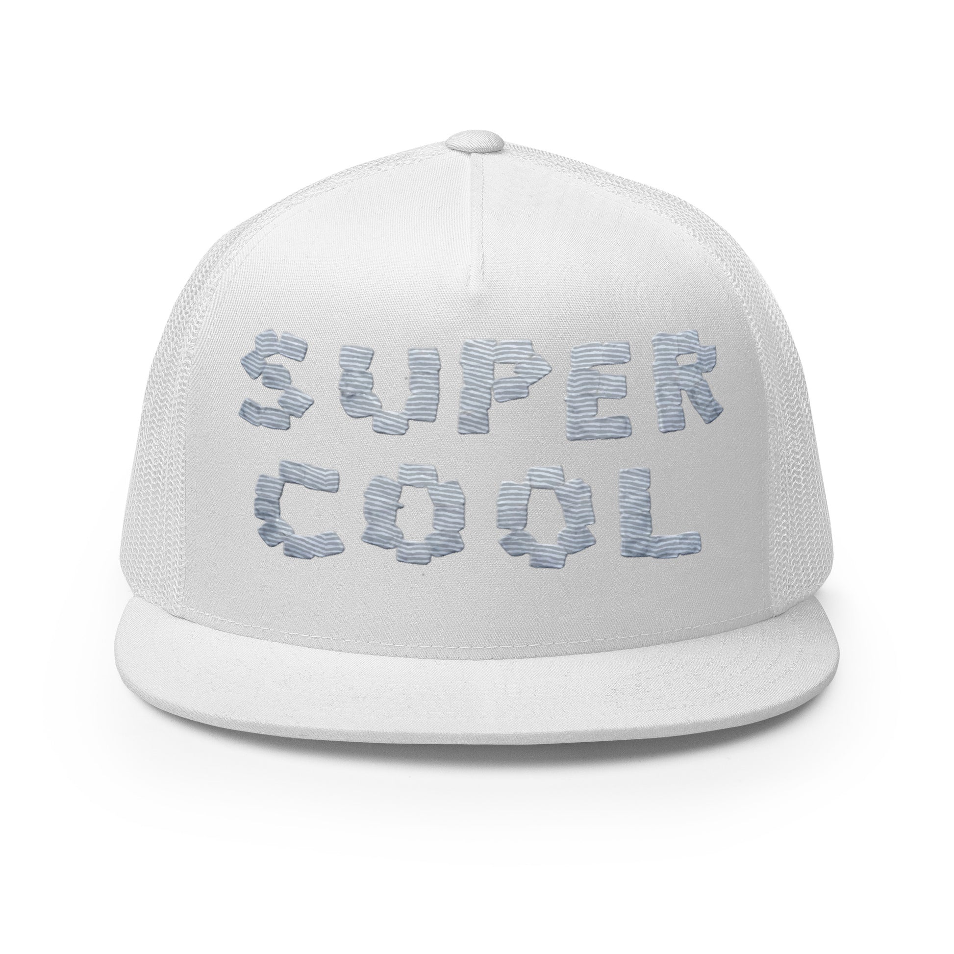 This 5-panel trucker cap isn’t just a hat — it’s an attitude. Featuring chunky “SUPER COOL” embroidery designed to look like melting ice cubes, this high-profile cap turns heads and keeps things chill.