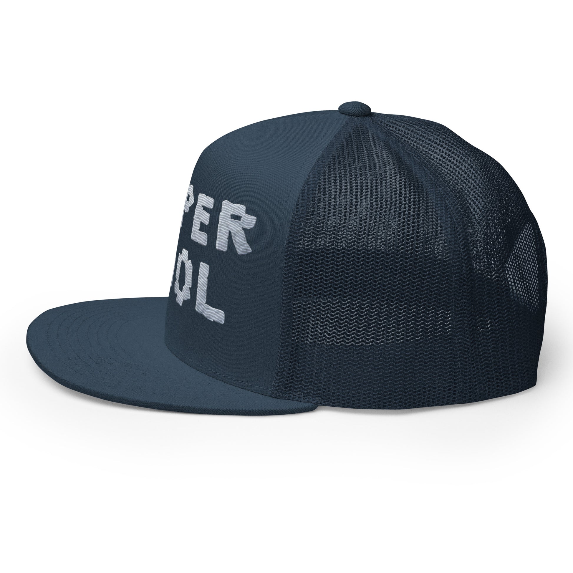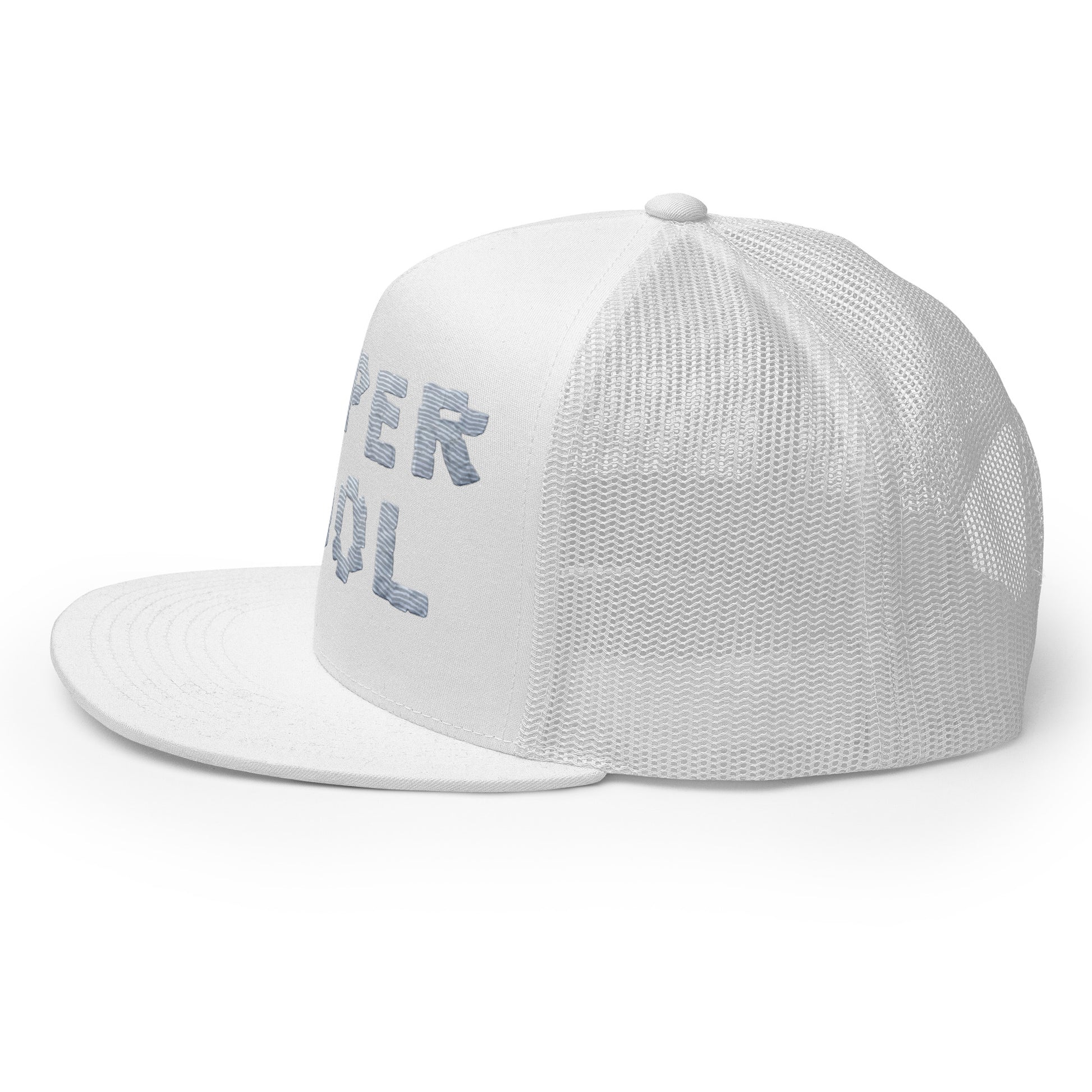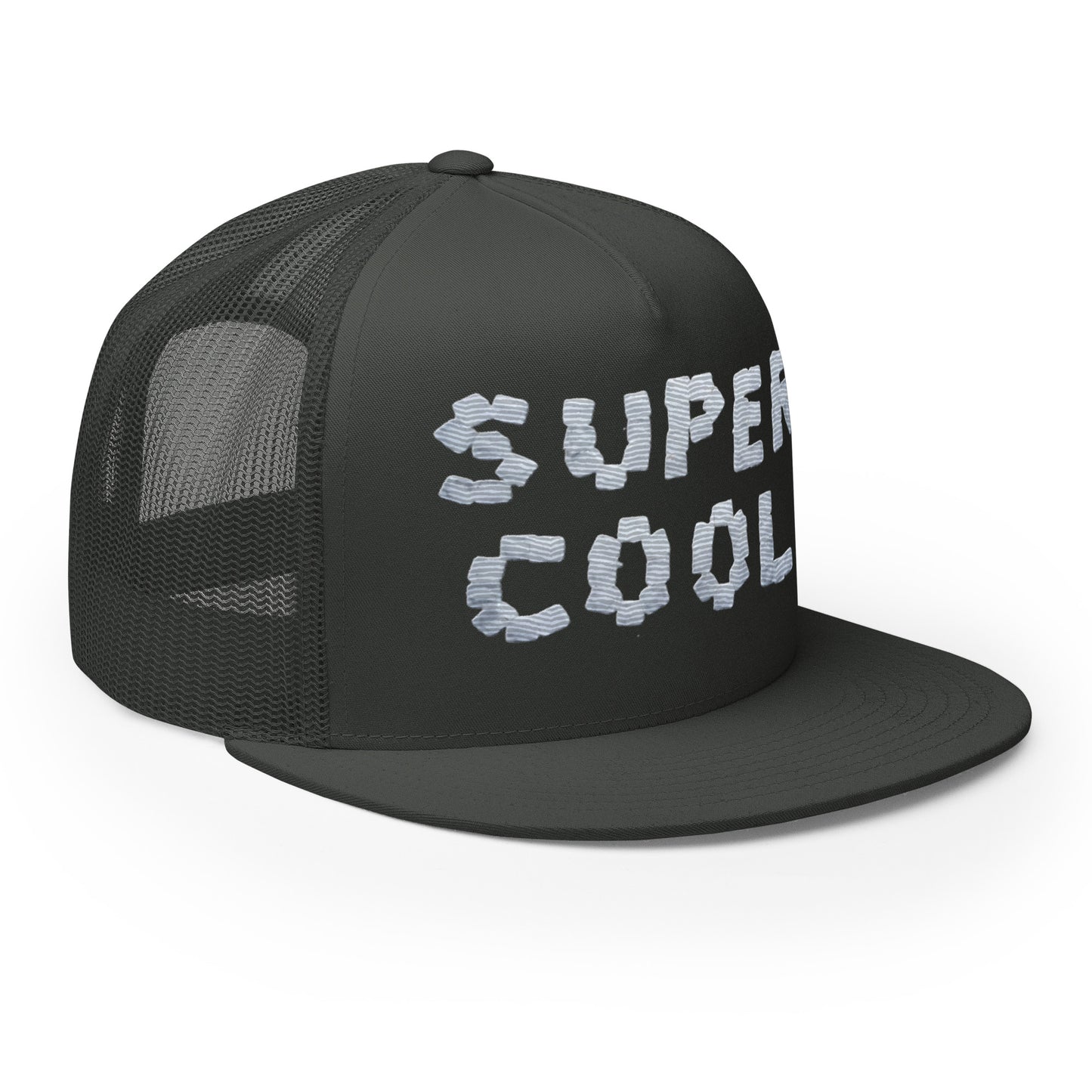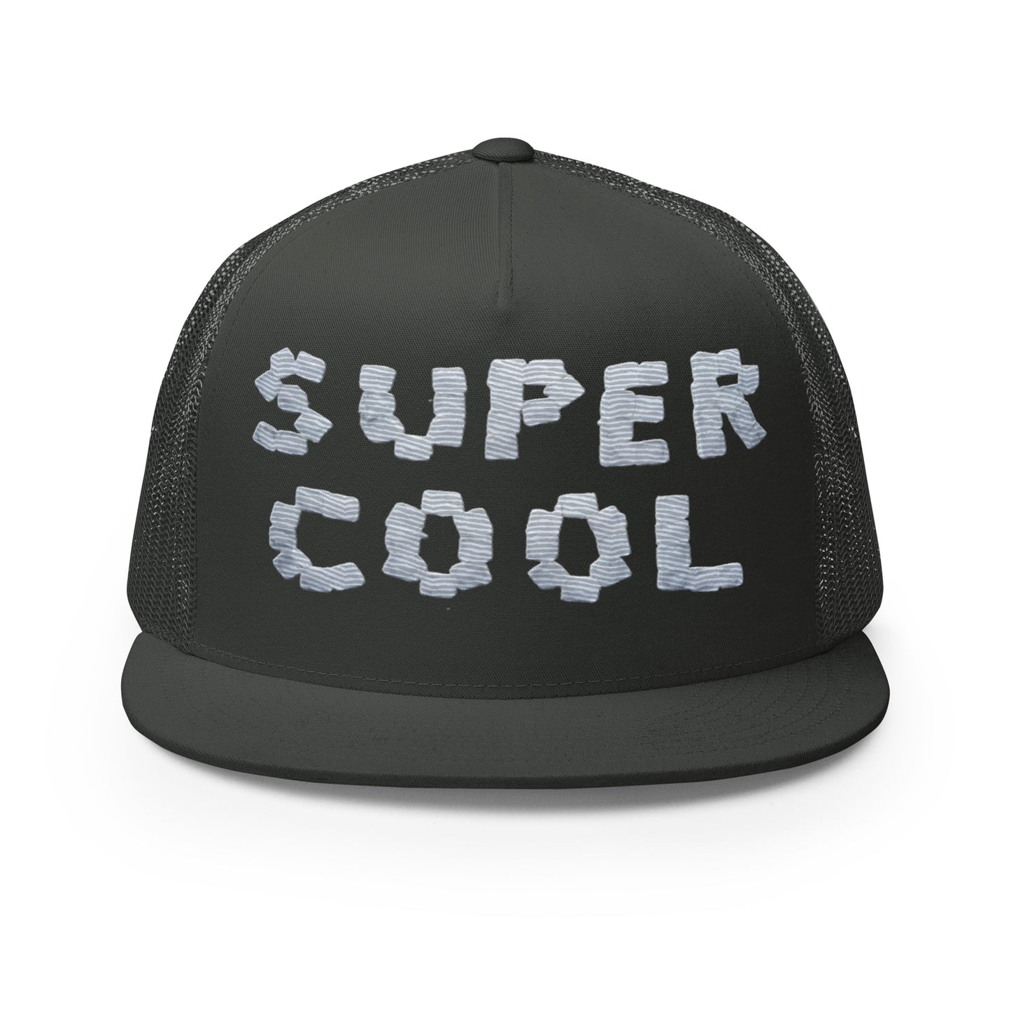 This 5-panel trucker cap isn’t just a hat — it’s an attitude. Featuring chunky “SUPER COOL” embroidery designed to look like melting ice cubes, this high-profile cap turns heads and keeps things chill.