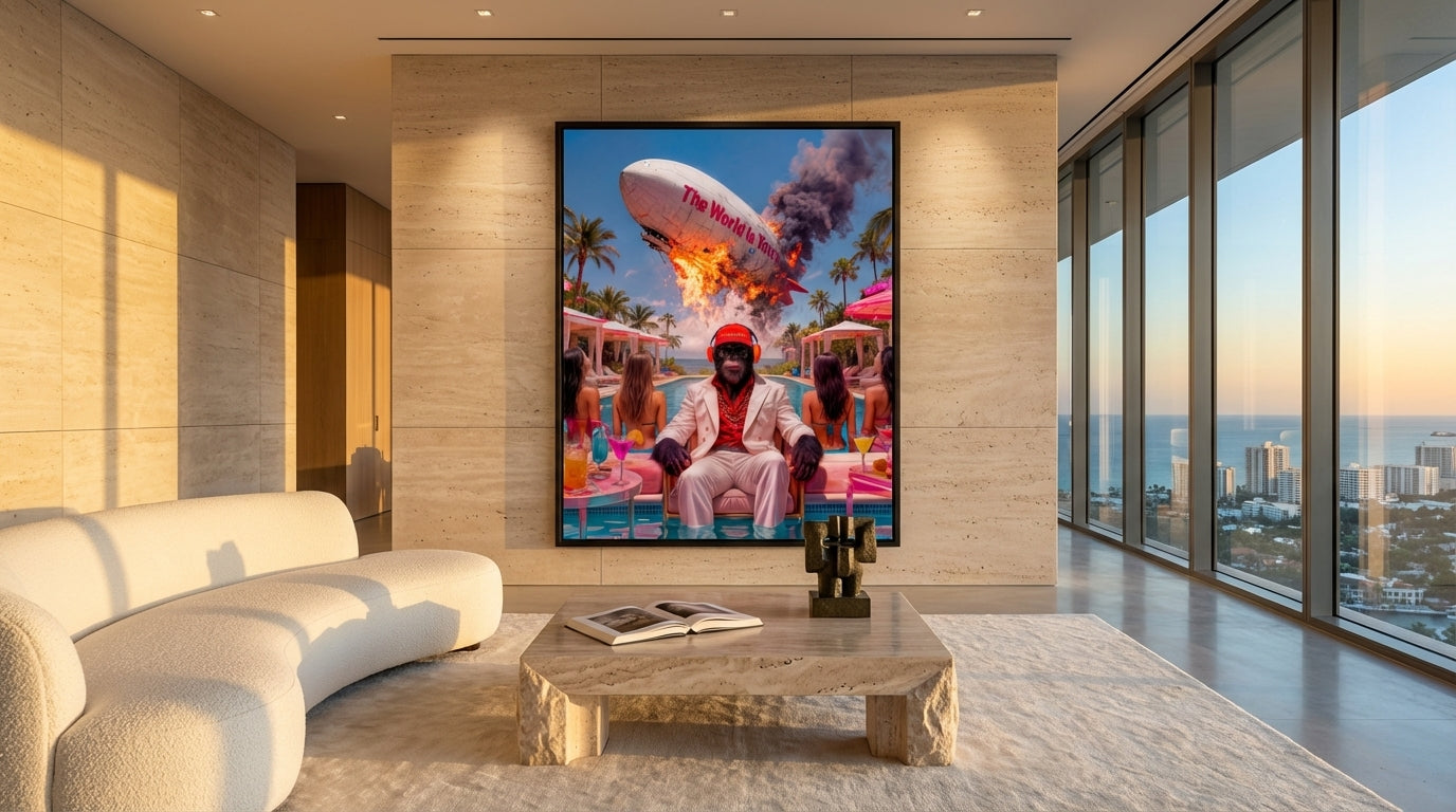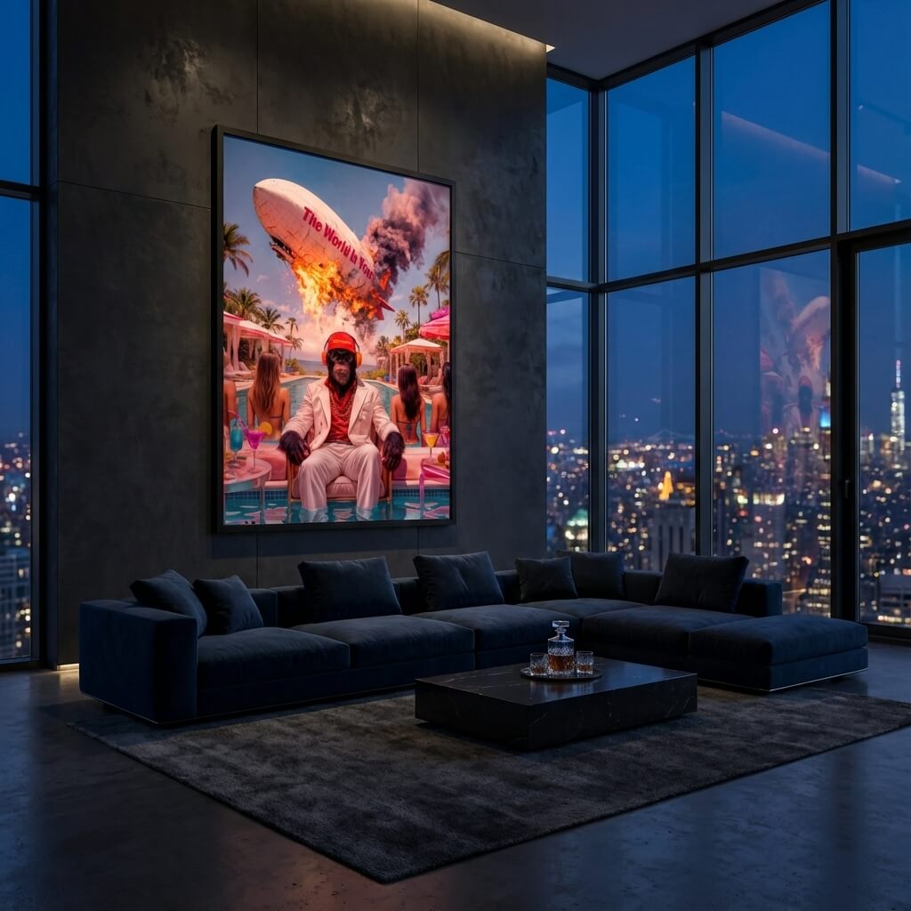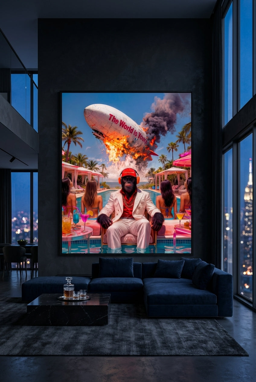 The World Is Yours is the explosive center of the 'Consume' series. It captures a moment of aestheticized consequence: a powerful figure, the ruler of hedonism, sits oblivious as the symbolic blimp bearing his conquest crashes in a blaze of fire behind him. The work is a vibrant critique of unchecked power, the surrender to the monkey brain and inevitable collapse.